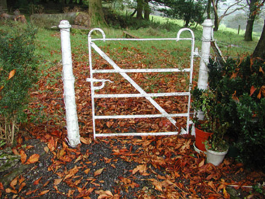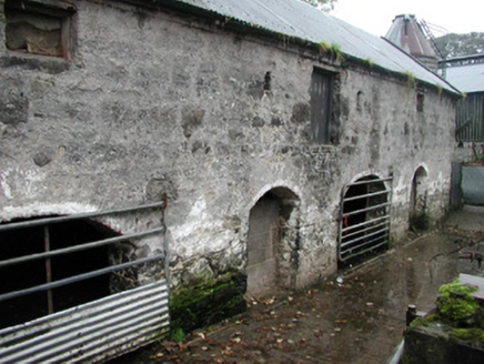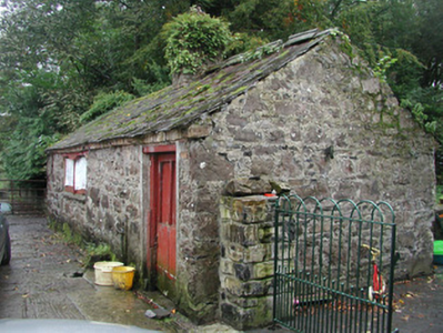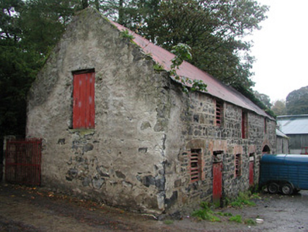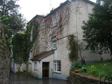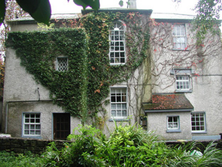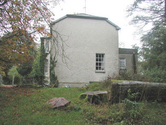 Detached three-bay two-storey-over-basement rendered house, built c. 1840. Full-height canted entrance bay to west elevation, full-height central staircase projection to east elevation. Half-hipped slate roof, hipped to entrance bay, clay ridge and hip tiles, unpainted roughcast corbelled chimneystacks, half-round cast-iron gutters, painted timber eaves and bargeboards. Unpainted roughcast walling, painted smooth-rendered plinth. Square-headed window openings, painted smooth-rendered slightly-projecting reveals, hood moulding to window on east elevation, limestone sills, painted six-over-six timber sash windows. Round-headed staircase window opening. Round-headed entrance door opening, painted smooth-rendered slightly-projecting reveals, painted timber door with eight raised-and-fielded panels c. 1995, cobweb fanlight over c.1995, wide approach steps bullnosed at base, painted smooth-rendered flanking balustrade walls with moulded coping. Bitmac carpark to front of house, lawns to west, wrought-iron field gate with cast-iron posts to south of house, linear outbuildings to north with pitched slate and corrugated-iron roofs, roughcast and exposed rubble stone walls with brick dressings to openings. House and outbuildings set back from road in mature woodland, approached by driveway from west, gate screen to road c. 1995.