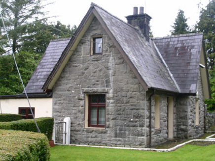 Detached three-bay single-storey-with-attic stone gate lodge, built c. 1890. Oblong plan, gabled break-front to north side of east elevation, gabled return to rear (west), flat-roofed single-storey extension wrapped around return. Steeply-pitched slate roof, clay ridge tiles, tooled ashlar limestone corbelled chimneystack, half-round cast-iron gutters on overhanging eaves, painted timber projecting bargeboards. Rock-faced squared-and-snecked ashlar limestone walling margined at corners. Square-headed window openings, painted smooth-plastered reveals including sills, rock-faced ashlar dressings, lancet-headed relieving arches over ground floor gable windows, uPVC casement windows c. 1995. Square-headed entrance door opening, hardwood half-glazed panelled door c. 1995. Concrete perimeter path, grassed areas, boundary hedges, dry stone boundary walls, bitmac driveway.