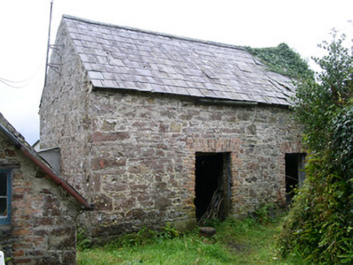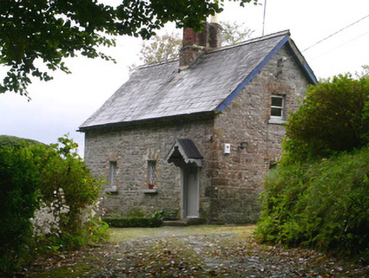 Detached three-bay single-storey-with-attic stone gate lodge, built c. 1880. Rectangular plan, small lean-to return to rear (north), bracketed porch canopy. Pitched slate roof, clay ridge tiles, central brick chimneystack with three diagonally set stacks, painted timber overhanging bargeboards, half-round cast-iron gutters on stone eaves corbel course. Random rubble stone walling, roughly-squared quoins. Square-headed window openings, brick dressings, painted smooth-rendered reveals, limestone sills, pair of cast-iron fixed-light lattice windows to south elevation, painted one-over-one timber sash windows to gable and return. Square-headed door opening, painted plain stone jambs and head, painted vertically-sheeted timber door with integral oblong light, gabled timber porch canopy, fretwork barges, profiled consoles. Fronting concrete driveway, approached from south-east, woodland setting, rubble stone outbuilding with slated roof to north.