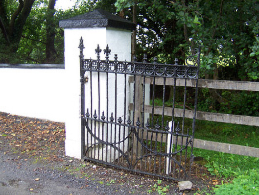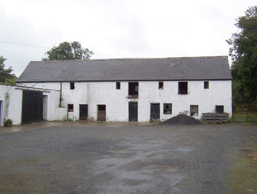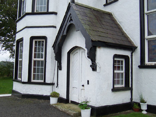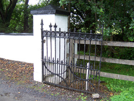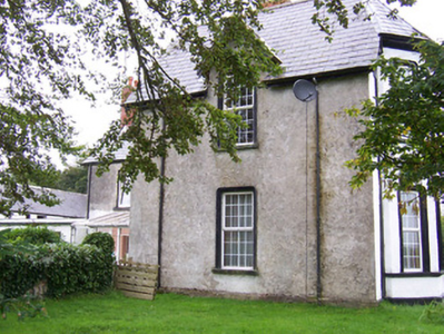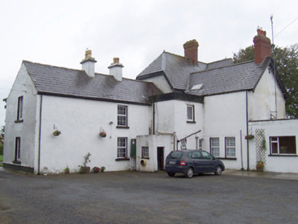 Detached multiple-bay two-storey rendered house, built c. 1840. L-plan, two-storey canted bay with hipped roof contiguous with main roof projecting from east leg, single-storey gabled porch in angle between east and north legs, three-bay two-storey lower wing projecting from north leg, two-storey lower wing projecting to rear (west) dropping to, single-storey flat-roofed extension c. 1970, two-storey flat-roofed extension in angle between north and west wings, single-storey flat-roofed porch in angle between extension and north wing, garden room with lean-to glass roof to south of north wing. Pitched slate roofs, half-hipped to north leg, clay ridge tiles, lead hip cappings, gabled dormer to south, red brick corbelled chimneystacks to main house and west wing, painted smooth-rendered corbelled chimneystacks to north wing, moulded cast-iron gutters, painted timber projecting eaves and bargeboards, decorative bargeboards with profiled brackets on stone corbels to porch. Painted roughcast walling, smooth-rendered plinth. Square-headed window openings, moulded architraves to main house with quadrant corners at head, painted stone sills, uPVC casement windows. Shallow pointed-arch transomed and mullioned stairwell window, stained-glass leaded-lights, secondary glazing. Shallow pointed-arch entrance door opening, painted framed and diagonally-sheeted timber double doors, stone step. Two-storey stable buildings to west of main house, pitched slate roof, lime-washed smooth-rendered walling, square-headed window and door openings, original cast-iron diamond-pane window surviving. Located at a distance off main road, approached from north along drive, wrought-iron double gates with cast-iron embellishments on plain smooth-rendered piers with pyramidal caps, surrounded by mature woodland.