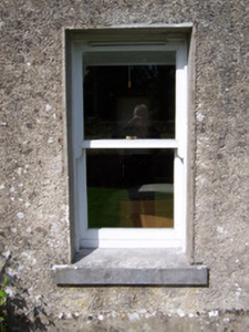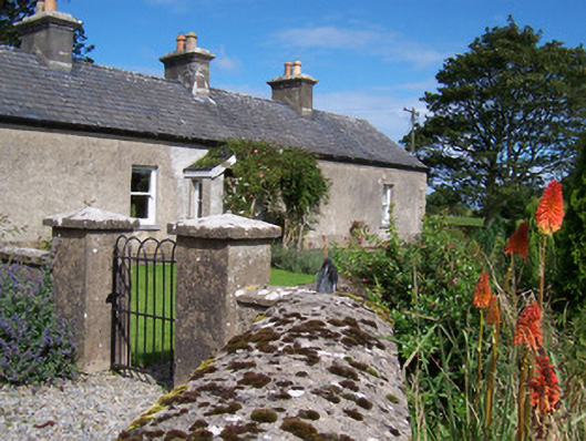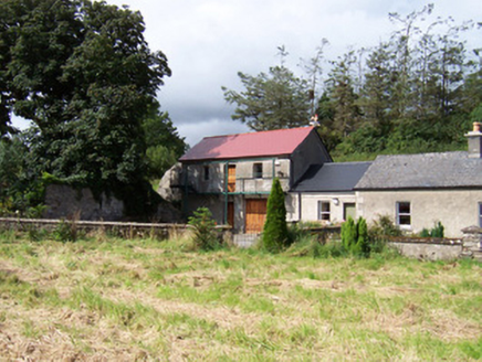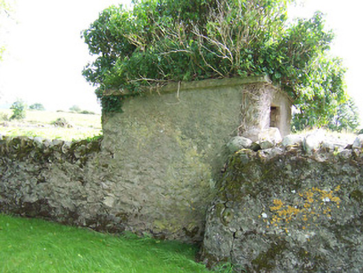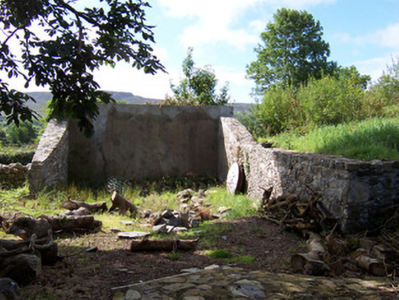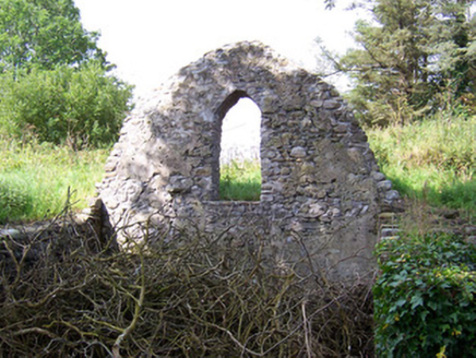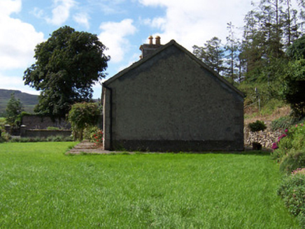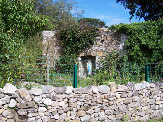 Detached stone church ruin, built c. 1750. Adjacent to extended cottage to east. North transept gable and west nave gable survive, shrine built into west gable c. 1950. Single pointed-arch window opening to north transept gable. Five-bay single-storey cottage with attached two-storey building. Pitched artificial slate roofs, smooth rendered chimneystacks, cast-iron rainwater goods. Unpainted roughcast walling, raised quoins, smooth-rendered plinth. Square-headed window openings, dressed stone sills, painted one-over-one timber sash windows c. 2000, timber casement windows to extension c. 2000. Square-headed door openings, painted timber vertically-sheeted door to south-facing porch. Both cottage and ruin are set back from road, dry stone boundary wall, Hooped wrought-iron garden gate, gravel courtyard, garden.