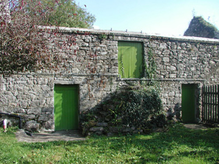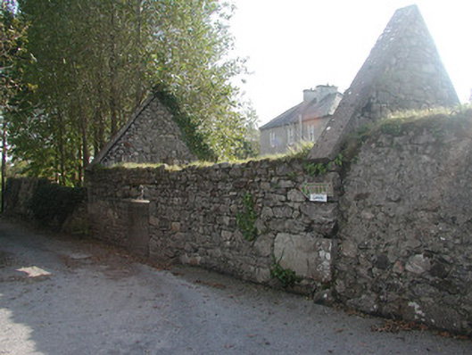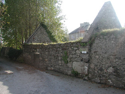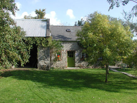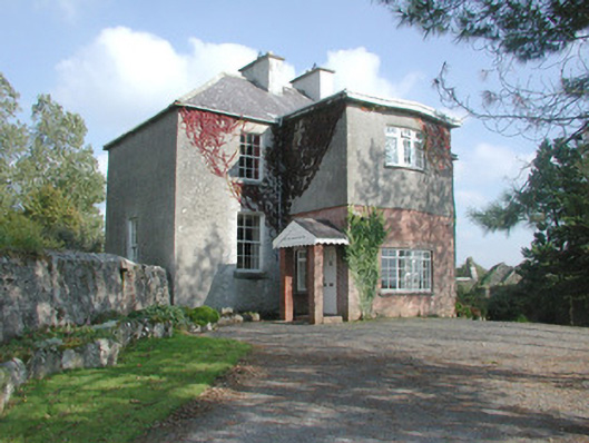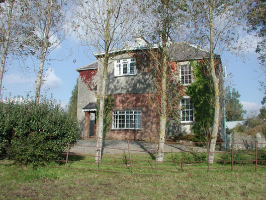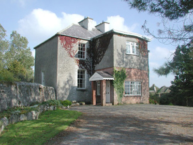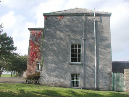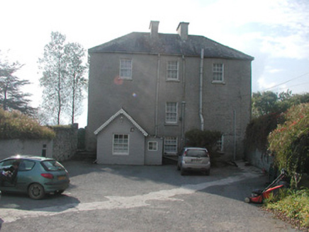 Detached three-bay two-storey over basement rendered house, built c. 1830. Flat-roofed two-storey central projection with slightly-bowed front to west (front) elevation c. 1973, single-storey gabled extension to east (rear) elevation c. 1973. Hipped slate roof, clay ridge and hip tiles, unpainted roughcast flat-capped chimneystacks, cast-iron rainwater goods. Unpainted roughcast walling, brickwork to bottom half of central projection. Square-headed window openings, smooth-plastered reveals, limestone sills, painted six-over-six timber sash windows, multi-paned faceted casements to central extension, painted timber to ground floor, uPVC to first floor. Squared-headed entrance door opening to north side of central projection, gabled canopy with decorative fascia carried on brick piers, painted timber panelled door. Original round-headed entrance door opening, sun burst fanlight, limestone steps and side walls survive in hall of extension. Set back from road behind high stone boundary walls, gravelled driveway and forecourt, courtyard and orchard to rear bounded by single- and two-storey outbuildings including original single-storey house c. 1780.