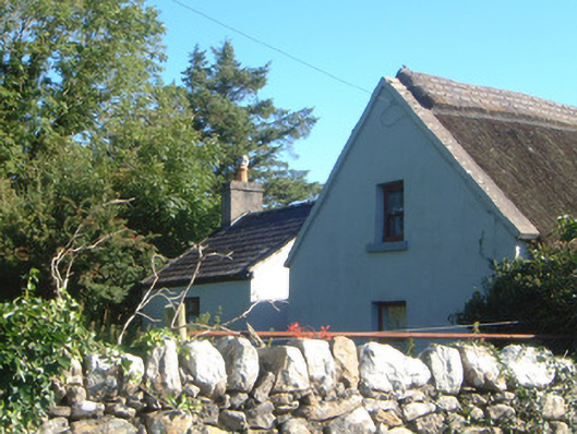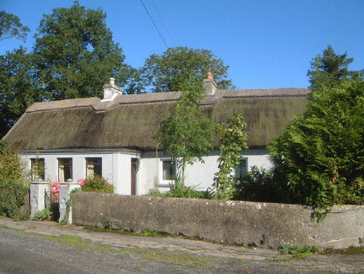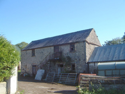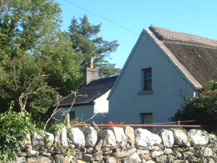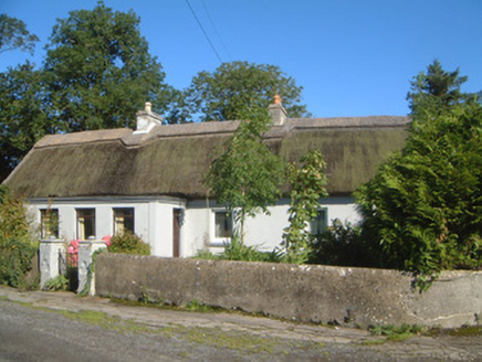 Detached five-bay single-storey thatched house with attic, built c. 1830. Projecting flat-roofed entrance porch c. 1980 to south (front) elevation. Straw-thatched roof, raised ridge, unpainted smooth-rendered corbelled chimneystacks, concrete verges to gables. Painted smooth-rendered walling. Square-headed window openings, painted masonry sills, painted one-over-one timber sash windows to gables and west of south elevation, timber casements c. 1980 to porch, uPVC casements c. 1995 to east of south elevation. Square-headed door opening to porch, hardwood panelled door c. 1980. Set back from road, unpainted smooth-rendered boundary wall, wrought-iron entrance gate, painted smooth-rendered gate piers. Single- and two-storey rubble-stone outbuildings to east, north and north-east. Two-storey range to east, pitched slate roof, cast-iron rainwater goods, brick surrounds to doors and windows, external staircase.