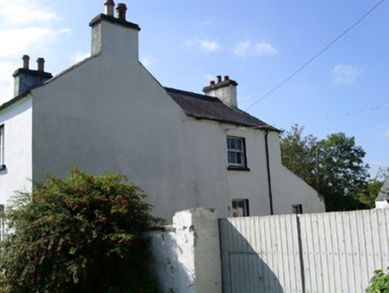Detached five-bay two-storey rendered house, built c. 1870. Flat-roofed porch to main (south) elevation, gabled two-storey return and lean-to outbuildings to rear (north). Pitched slate roof, clay roll-top ridge tiles, painted smooth-rendered chimneystacks with yellow clay pots, cast-iron half-round gutters on eaves corbel course. Painted smooth-rendered ruled-and-lined walling, projecting plinth. Square-headed window openings, painted stone sills, painted timber casement windows to west side of front elevation and painted two-over-two timber sash windows elsewhere, coupled one-over-one sash windows to east side of front elevation. Square-headed door opening to porch, glazed hardwood screen c. 1990 with painted timber panelled door within. Gravelled forecourt approached from driveway to south-east, painted smooth-rendered wall with timber gates extends from south-west corner of house giving to farmyard.