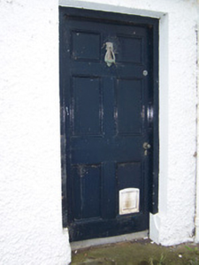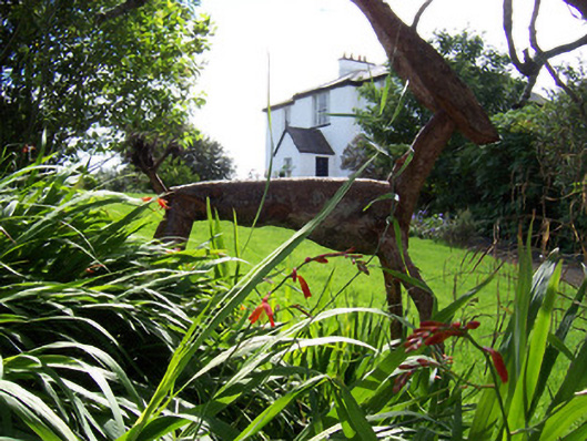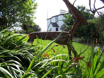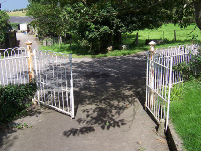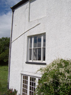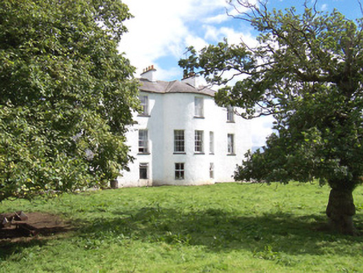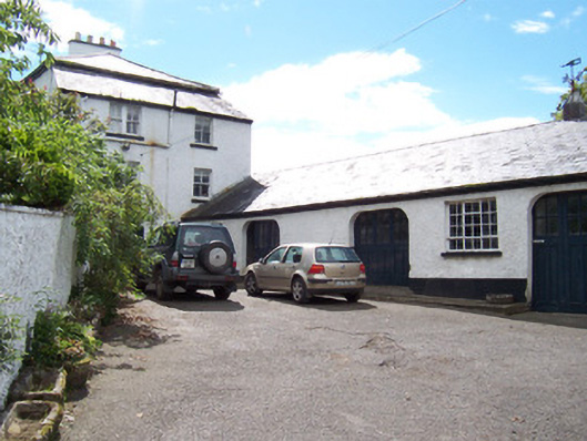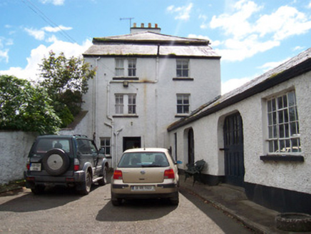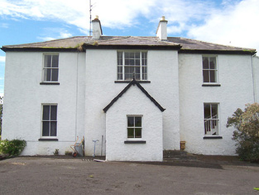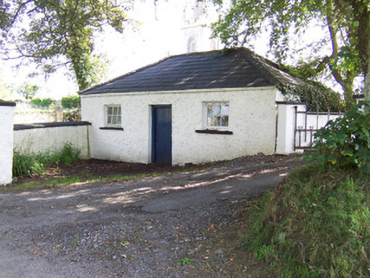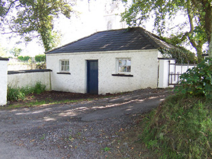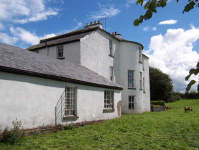 Detached three-bay two-storey over basement rendered former rectory, built c. 1810, in use as farmhouse since 1930. Rectangular plan, basement exposed as ground floor to west elevation, single-bay breakfront to east elevation with projecting single-storey gabled porch, three-storey central bow to west, lean-to three-storey wing to north to full width of main house, single-storey linear outbuilding to north offset to west. Hipped slate roofs to main house with conical roof over bow, pitched slate roofs to porch and outbuilding, clay ridge and hip tiles, half-round cast-iron gutters on eaves corbel course, moulded gutters to porch and outbuilding. Painted roughcast walling. Square-headed window openings, smooth-rendered reveals, painted stone sills, painted two-over-two timber sash windows, tripartite six-over-six flanked by four-over-four above porch, six-over-six to three ground floor windows to bow, painted timber casement windows to basement and outbuilding. Square-headed entrance door opening to north side of porch, painted timber six-panel door. Gravelled forecourt with grass central space. Narrow courtyard to east of outbuilding, high rubble stone wall further to east. Located on axis with church to east, approached by long driveway, gate lodge with hipped roof at entrance, wrought-iron gates.