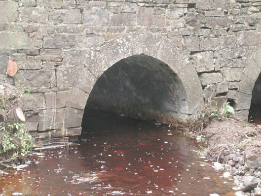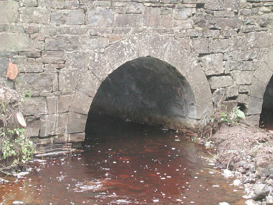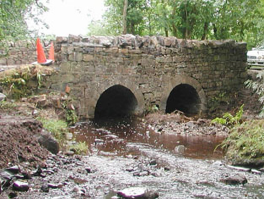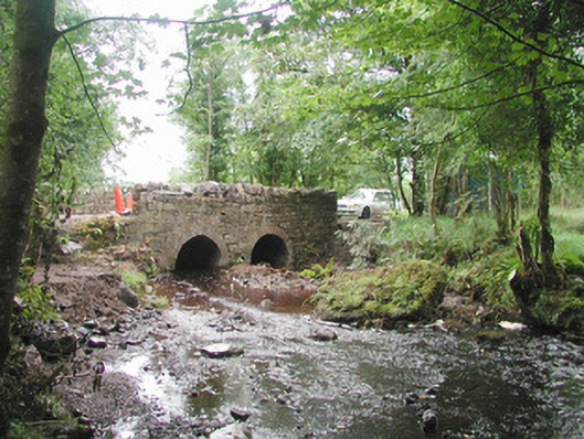 Double-span road-over-river stone bridge, built c. 1800. Roughly-squared uncoursed rubble walling. Round-headed arches, tooled ashlar limestone voussoirs, rubble stone parapets rebuilt c. 1990, as-found stone coping. Macadamed carriageway, concrete footpaths. Crosses north-south over stream, in woodland setting.