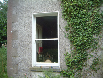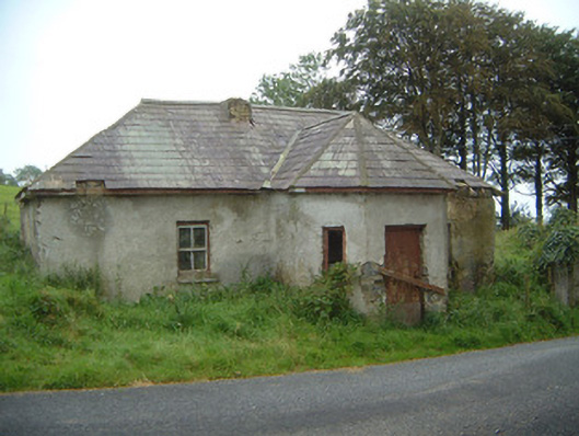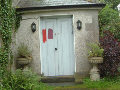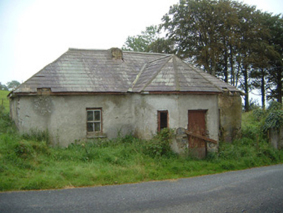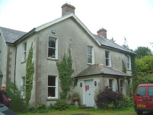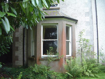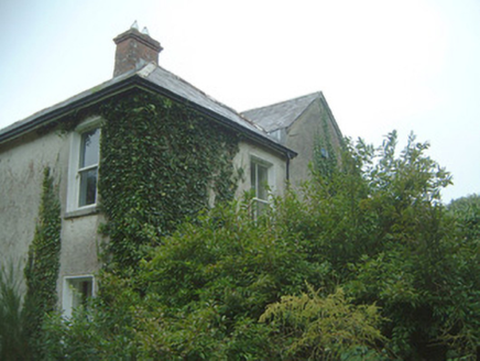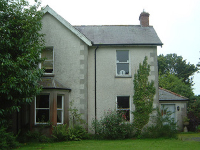 Detached multi-bay two-storey rendered house, built c. 1900. T-plan, gabled north-south block with gabled wing to west from which projects single-storey hipped-roof porch, two-storey hipped-roof wing in angle between north-south block and west wing, single-storey canted bay with hipped roof to north gable of north-south block. Pitched and hipped slate roofs, clay ridge and hip tiles, brick corbelled chimneystacks, profiled uPVC gutters on painted timber fascias on exposed rafter ends, painted timber projecting bargeboards. Unpainted roughcast walling, smooth-rendered quoins, bay and plinth. Square-headed window openings, painted smooth-rendered reveals, limestone sills, painted one-over-one timber sash windows. Square-headed door opening to porch, painted smooth-rendered reveals, tooled limestone plinth blocks, painted timber double doors each with single vertical raised-and-fielded panel, wrought-iron bell-pull. Set at end of narrow driveway, surrounded by mature farmland. Three-bay single-storey gate lodge c. 1850, at entrance, now derelict, projecting canted central entrance bay, hipped slate roof, two-over-two sash windows, vertically-sheeted entrance door.
