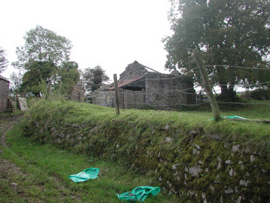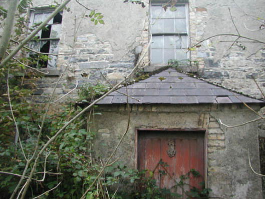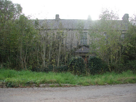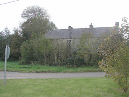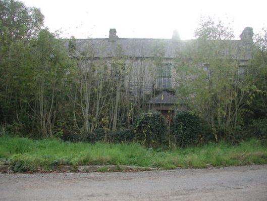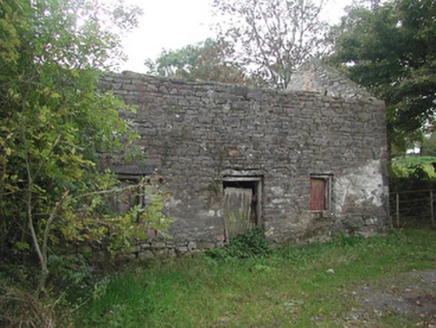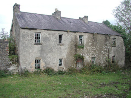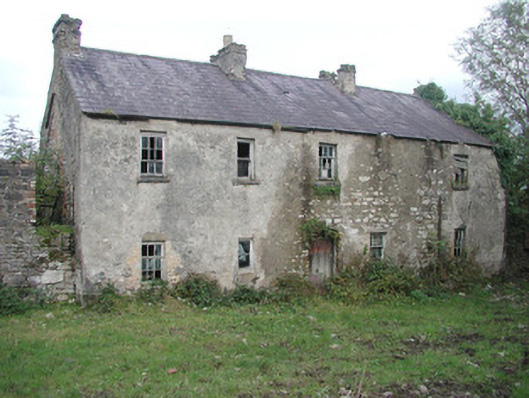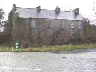 Detached five-bay two-storey rendered former farmhouse, built c. 1850, now in ruins. Hipped roof porch to north, linear outbuilding to west. Pitched slate roof, clay ridge tiles, roughcast corbelled chimneystacks, half-round cast-iron gutters on eaves corbel course. Unpainted roughcast walling, limestone sills, painted six-over-six timber sash windows to front elevation, six-over-three to rear. Square-headed door openings, painted vertically-sheeted doors. Two single-storey out-buildings to south. Set-back from roadside, rubble stone boundary wall, hooped wrought-iron gate.