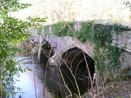 Triple-span gently-curved road-over-river stone bridge, built c. 1840. Uncoursed rubble limestone walling, ashlar string course, triangular coursed ashlar limestone cutwaters with pyramidal caps. Shallow pointed-arched openings, ashlar voussoirs with chamfered reveals. Tooled ashlar limestone parapet copings. Battlemented octagonal turret terminates parapet wall at south-west. Carries demesne road, leading to stable yard and farm buildings, over Arrow Unshin River.