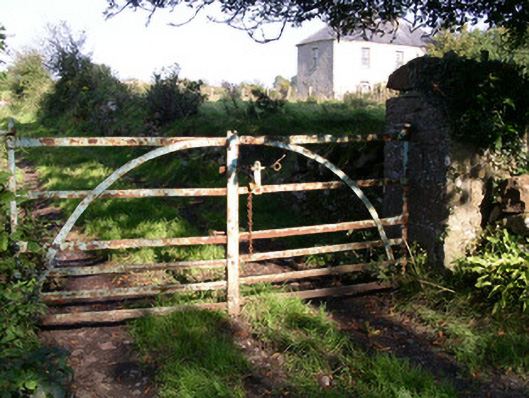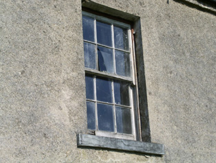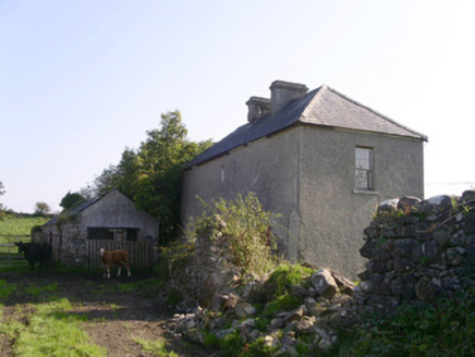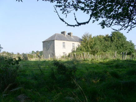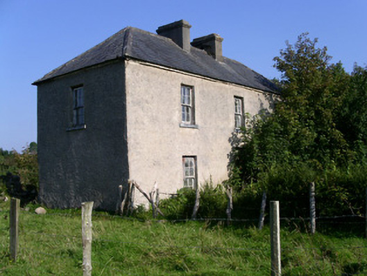 Detached three-bay two-storey rendered house, built c. 1840. Hipped slate roof, clay ridge and hip tiles, unpainted smooth-rendered corbelled chimneystacks, half-round cast-iron gutters on eaves corbel course. Unpainted roughcast walling. Square-headed window openings, smooth-rendered reveals, dressed limestone sills, painted six-over-six timber sash windows. Small window to middle of rear second storey. Square-headed door opening, painted vertically-sheeted timber door, narrow overlight. Set back from road, fronted by grass, rubble stone boundary walls, wrought-iron farm gate, drinking trough to roadside.