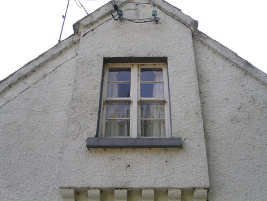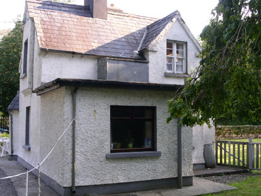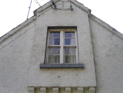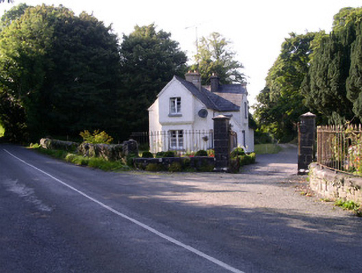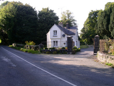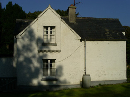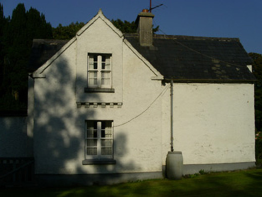Detached two-bay single-storey rendered gate lodge with gable-fronted attics, built c. 1880. L-plan, dormer bays projecting slightly supported on painted stone corbels, gable-fronted entrance porch set diagonally in angle of L, single-storey flat-roofed extension, c. 1980, to rear (north). Pitched slate roof, clay ridge tiles, unpainted smooth-rendered corbelled chimneystacks, half-round cast-iron gutters on eaves corbel course. Painted roughcast walling, smooth-rendered recessed plinth. Square-headed window openings, smooth-rendered reveals, painted stone sills, painted two-over-two timber coupled sash windows. Shallow pointed-arched entrance doorway, painted vertically-sheeted timber door. Estate entrance gateway to south-east, ashlar limestone gate piers, pyramidal caps, rubble stone quadrant walls, ashlar limestone bull-nosed copings, wrought-iron gates and railings. Similar gateway directly opposite on other side of road. House set back from road with garden to west, south and east, driveway to Markree Castle passes to east.