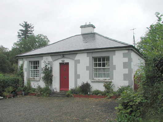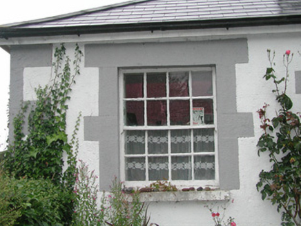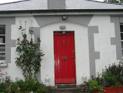 Detached three-bay single-storey rendered house, built c. 1880. Hipped artificial slate roof, clay ridge and hip tiles, painted smooth-rendered corbelled chimneystacks, half-round cast-iron gutters on painted timber projecting fascia. Painted smooth-rendered ruled-and-lined walling, painted stone flush quoins. Square-headed window openings, painted block-and-start flush stone dressings, painted stone sills, painted eight-over-eight timber sash windows. Square-headed central door opening in segmental-headed recessed arch, painted vertically-sheeted timber door, two stone steps. Small gravelled area to south, rubble stone boundary walls, opposite rear entrance to Templehouse demesne.