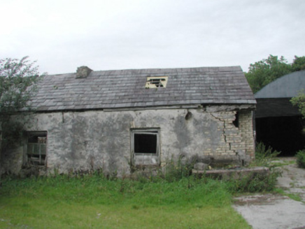 Detached multiple-bay single- and two-storey rendered farmyard c. 1870. Pitched slate roofs. Limewashed roughcast walling. Square-headed window openings, stone sills, painted six-over-six timber sash windows. Square-headed door openings, painted vertically-sheeted timber doors. In an advanced stage of decay, modern corrugated-iron barn to north-east, located to north of stableyard, north of Temple House.
