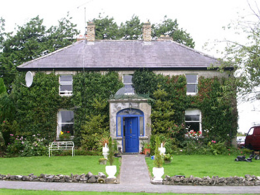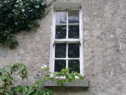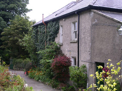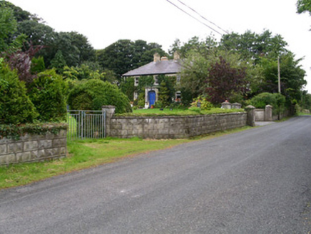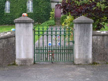 Detached three-bay two-storey double-pile rendered manse, built c. 1875. Single-storey flat-roofed porch projects centrally from east elevation, lean-to return to rear. Hipped slate roofs, clay ridge tiles, yellow brick corbelled chimneystacks, uPVC gutters c. 2000 on painted timber projecting eaves. Unpainted roughcast walling, smooth-rendered plinth, moulded cornice to porch roof, decorative cast-iron railings to edge of porch roof. Square-headed window openings, smooth-rendered reveals, dressed limestone sills, painted one-over-one timber sash windows, four-over-four timber square-headed window to north elevation. Elliptical-headed entrance door opening to porch, limestone step, painted timber door with four-panels and moulded members, plain-glazed sidelights, sunburst fanlight. Lawn to front, paths and yard to rear, smooth-rendered wall fronting main road, decorative wrought-iron gates on smooth-rendered piers. Church to south-east.