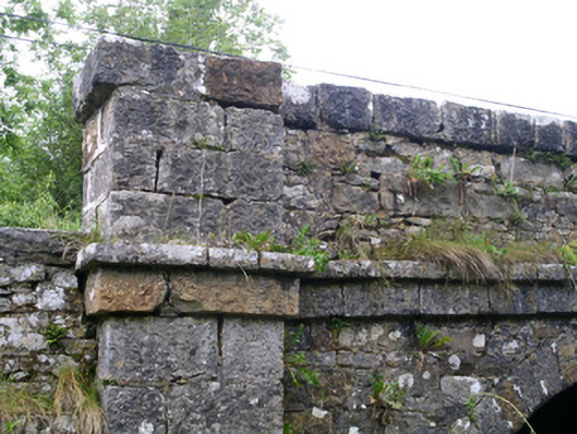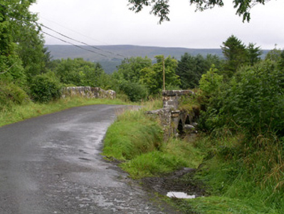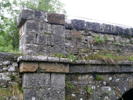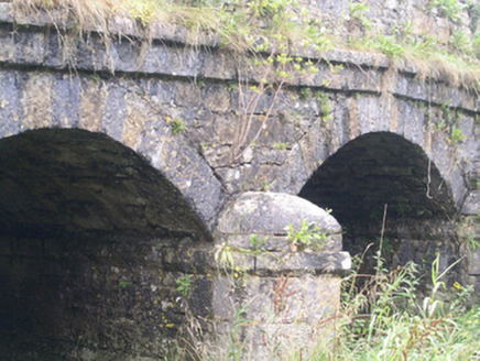 Three-span stone road-over-river bridge, built c. 1820. Roughly-squared rubble limestone walling to spandrels and parapets, dressed limestone platband with string over at deck level, dressed limestone square parapet copings, pilasters rising to become piers at ends of parapets, pyramidal dressed limestone caps. Segmental-headed arches, dressed limestone voussoirs, coursed dressed limestone piers between arches terminating in semi-circular cutwaters, chamfered impost string, domed caps. Single bitmac carriageway, narrow grass verges. Spans east-west over Feorish River.