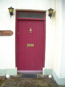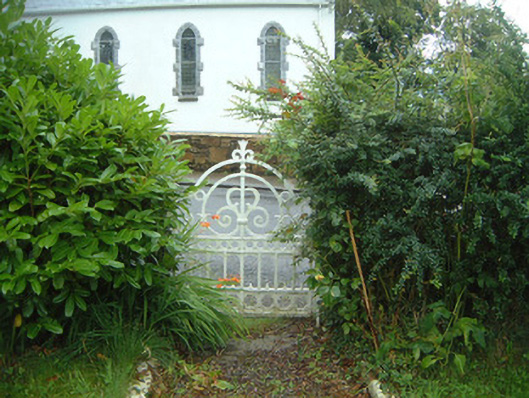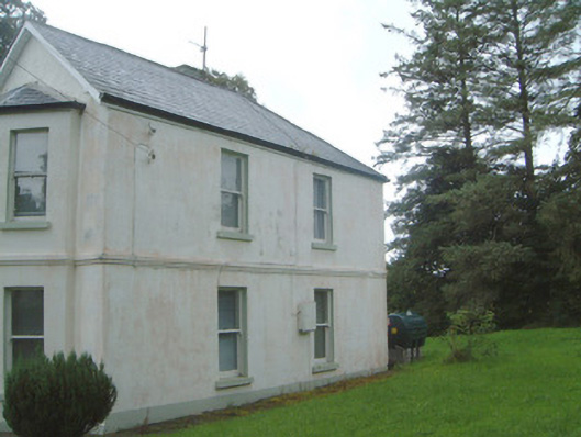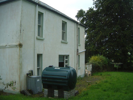Detached two-bay two-storey rendered house, built c. 1910. L-plan, two-storey canted bay window to east gable-end, single-storey lean-to entrance porch in angle of L c. 1950, single-storey lean-to extension to south elevation c. 1950. Hipped slate roof, clay ridge and hip tiles, lead hip cappings to bay, painted smooth-rendered corbelled chimneystack, profiled extruded aluminium gutters on painted timber fascia, projecting painted timber bargeboards to east gable. Painted smooth-rendered ruled-and-lined walling, projecting plinth, string course at first floor. Square-headed window openings, painted stone sills, painted one-over-one timber sash windows. Square-headed door opening, plain-glazed overlight, painted vertically-sheeted timber door c. 1995. Set back from road in grounds, yard to south, rubble stone boundary walls, decorative cast-iron pedestrian gate to east, quadrant gatescreen with wrought-iron flat-bar gate to south-east. St Joseph's Catholic church across road to east.