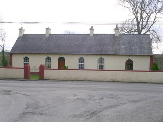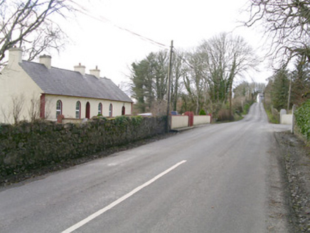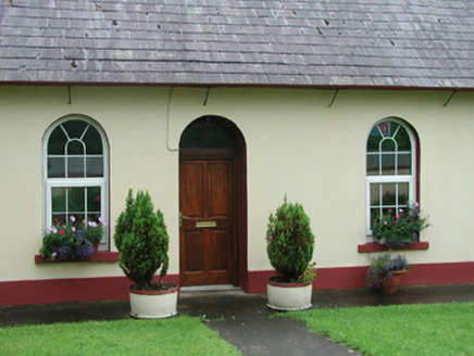 Detached six-bay single-storey rendered former gate lodge, built c. 1900. Pitched slate roof, clay ridge tiles, painted smooth-rendered corbelled chimneystacks, half-round cast-iron gutters on brackets splayed from wall face on overhanging eaves, cast-iron downpipes. Painted smooth-rendered walling, contrasting painted straight margins at corners, projecting plinth. Round-headed window openings, painted stone sills, uPVC casement windows c. 2000. Round-headed recessed door opening, plain-glazed fanlight, hardwood door with four raised-and-fielded panels c. 2000. Secondary round-headed door opening to west, plain-glazed fanlight, hardwood panelled door c. 2000. Garden to north and south (rear), bounded by painted smooth-rendered wall, decorative wrought-iron pedestrian gate. Situated on rise above River Moy.