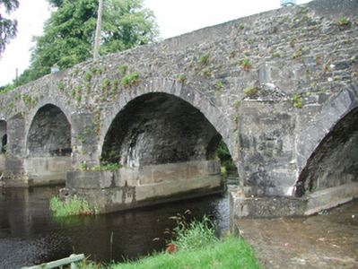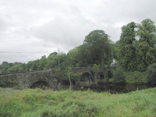 Five-span road-over-river stone bridge, built c. 1820. Uncoursed rubble limestone walling rising to form parapets. Dressed stone block parapet copings mostly replacement with concrete c. 1950. Round-headed arches, ashlar limestone voussoirs, lower section of triangular ashlar stone cutwaters and piers between arches encased in concrete c. 1990, half-pyramid ashlar caps. Twin bitmac carriageway. Spans north-south over River Moy.
