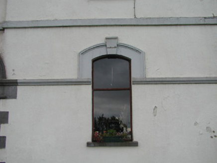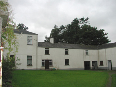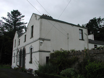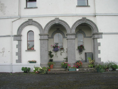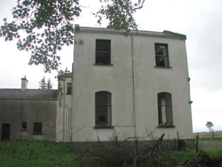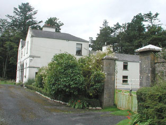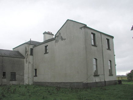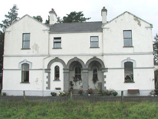 Detached four-bay two-storey rendered house, built c. 1870. Front (south) elevation with central three-arched recessed porch flanked by slightly-projecting gable fronts, rear (north) elevation blank except for two small windows one at ground floor and one at first floor, lower two-storey L-plan wing extends from north-east. Pitched slate roofs, hipped to north-east, clay ridge and hip tiles, painted smooth-rendered chimneystacks, ashlar stone verges returning on horizontal as springers to gables, profiled extruded aluminium gutters. Painted smooth-rendered walling, first floor platband, impost string at ground floor, moulded plinth. Segmental-headed window openings to ground floor, square-headed to first floor, hood mouldings and keystones to gable fronts, limestone sills, hardwood one-over-one casement windows c. 1970, painted timber sash windows in porch. Round-headed arches to porch, one infilled, moulded ashlar limestone archivolts with plain keystones on impost moulding on square ashlar limestone piers. Square-headed door opening within porch, moulded lintel with keystone, painted timber door with three panels. Open pasture to south, walled garden to east, woodland to west, ashlar limestone gate piers with pyramidal caps, original gates missing.