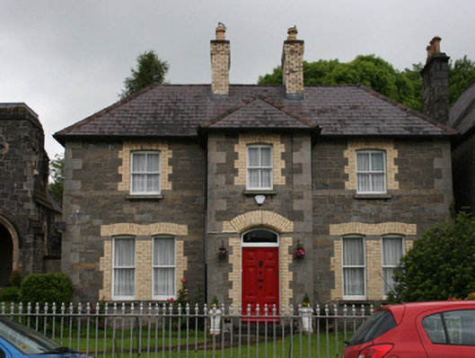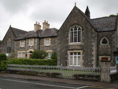 Detached three-bay two-storey former Methodist manse, built c.1875, with projecting central entrance bay and two-storey return to rear. Now in use as private residence. Hipped slate roofs with bracketed eaves, clay ridge tiles, stepped yellow brick chimneystacks and some cast-iron rainwater goods. Squared limestone walls with tooled limestone quoins and having limestone platbands to ground floor window head level and first floor sill level. Camber-arched window openings with limestone sills, yellow brick surrounds and one-over-one timber sliding sash windows to ground floor and two-over-two timber sliding sash windows to first floor, rear and side elevations. Segmental-headed door opening with moulded yellow brick reveals, glazed overlight and timber panelled door. Cast-iron railings on a limestone plinth to boundary with street. Single-storey outbuilding to rear yard.