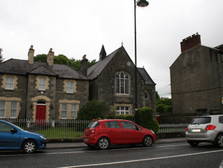 Detached gable-fronted two-bay two-storey masonic hall, built 1885, with projecting pair of gables to north elevation and lean-to extension to rear. Pitched slate roof with courses of scalloped purple slates, terracotta ridge tiles, timber louvred vent to central ridge and uPVC rainwater goods. Snecked limestone front elevation with dressed quoins and plaque over entrance with mason’s symbol and date 1885. Roughcast rendered walls to side elevation and red brick to extension. Square-headed window opening with stone label moulding to ground floor of gable front with tooled block-and-start sandstone window surround and tripartite timber casement window having stained glass overlights with lead glazing bars. Tudor arched window opening with stone label moulding to first floor of front gable, tooled block-and-start sandstone window surround with stained glass, lead glazing bars and timber mullions. Subtriangular window opening with hood moulding to first floor of entrance bay with sandstone surround and stained glass window. False-arched opening to entrance bay formed of lintel on corbels with sandstone surround, hood moulding and timber tongue and groove door with ornate hinges. Fine open-well stairs to first floor with principal meeting hall. Corbelled trusses to meeting hall ceiling, wainscotting and elevated platform to front wall, retaining original furniture and fittings. Ornate cast-iron railings resting on coursed rubble plinth wall with limestone coping to street, with dressed stone pier to north and coursed rubble wall with pier to northern boundary.