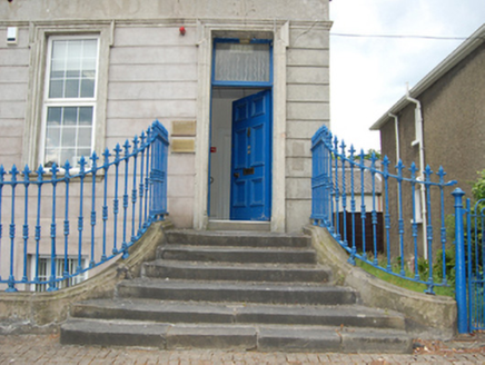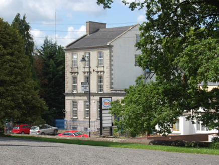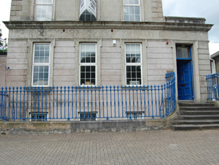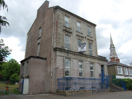 Detached three-bay three-storey over basement neo classical style former bank, built 1862-3, with single-storey entrance bay to north, dormer attic and return to rear. Now in office use. Pitched slate roof with moulded cornice and pulvinated frieze, rendered chimneystack to gable, two dormer windows to the rear pitch, and some sections of cast-iron rainwater goods. Smooth rendered walls with raised block-and-start quoins and shouldered window surrounds and pedestals to second storey, cornice hoods with consoles and keystones to first floor windows. Rendered fascia with dentilated cornice extending across single-storey entrance with traces of former lettering reading “Provincial Bank of Ireland”. Channel-jointed rusticated render to ground floor with shouldered architraves to entrance door. Smooth render and raised block-and-start quoins to the rear elevation and return. Replacement uPVC windows to front, six-over-six timber sash windows to return. Bolection panelled timber main entrance door with single-pane overlight opening onto curved flight of limestone steps with cast-iron railings having fleur-de-lys finials on moulded cut-stone plinth enclosing basement area. Cut jostle stone protecting corner railings.