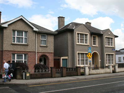 Detached three-bay two-storey house, built c.1945, with internal porch, pair of advanced gable-fronted bays and three-bay two-storey side elevation. Hipped slate roof with overhanging eaves, rendered chimneystacks and cast-iron rainwater goods. Pebble-dashed walls with smooth-rendered plinth and surrounds to porch opening and windows. Tripartite windows to gabled bays comprising six-over-six central sliding sashes and four-over-four sliding-sash side lights, six-over-six sliding sash window above door in central bay. Round arch to open porch with recessed square-headed front door opening having tripartite multiple-pane overlight, fixed sidelights, raised and fielded six-panelled timber door and decorative tiled threshold. Central tripartite window to side at ground level matching front elevation, with eight-over-eight sliding sash windows, one opening reduced in size and uPVC window inserted. Smooth-rendered boundary wall and piers with decorative steel railings and gate.