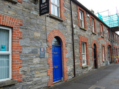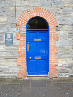 Terraced two-bay two-storey house, built 1887, now in commercial use. Pitched artificial slate roof, red-brick chimney stack and replacement uPVC rainwater goods. Render removed exposing roughly squared rubble stone walls. Red-brick block-and-start window surrounds with cut-stone sills and replacement timber casement windows. Round-headed red-brick door surround with single-pane fanlight and replacement panelled door. Opens directly onto street.