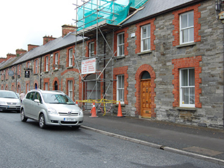 Terraced four-bay two-storey house, built 1887 with integral carriage arch to northern bay and three-bay two-storey return to the rear. Pitched artificial slate roof, rendered chimney stacks with decorative pots to south party wall, and replacement rainwater goods. Render removed exposing roughly squared rubble stone walls. Smooth rendered walls to rear elevation and roughcast rendered walls to return. Segmental-arched carriageway with red-brick surround and yellow brick keystone. Red-brick block-and-start window surrounds with cut-stone sills and two-over-two timber sliding sash windows. Round-headed red-brick door surround with single-pane fanlight and replacement panelled door. Opens directly onto street.