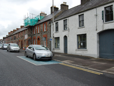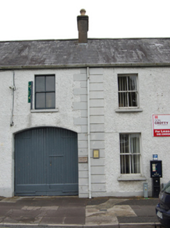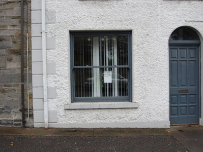 Terraced four-bay two-storey house, built 1887, with integral carriage arch to southern bay. Pitched slate roof, rendered chimneystacks with decorative pots at centre and at southern party wall, and replacement rainwater goods. Roughcast render walls with raised block-and-start quoins and plinth, square-headed window openings, wider at the ground floor, with painted sills and two-over-two timber sliding sash windows. Round-headed door opening with single-pane fanlight and replacement panelled door. Segmental-arched carriageway with sheeted timber double-leaf doors incorporating a wicket door. Opens directly onto street.
