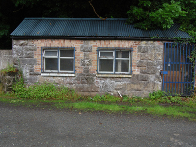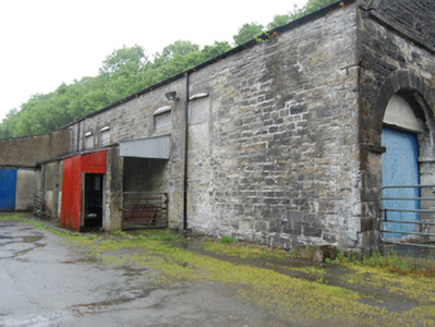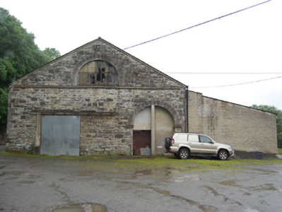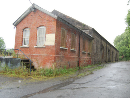 Detached five-bay double-height former goods shed, built c.1865, with single-storey four-bay red-brick former goods office to south, c.1920, and later lean-to extension to west. Now part of livestock mart. Pitched slate roof with cast-iron rainwater goods. Squared rubble stone walls with dressed quoin stones. Semi-circular arch with dressed voussoirs in upper level of both gables comprising blind rendered recess to south and window opening to north. Cut-stone string courses at cill level defining traingular gable. Round-arched openings with dressed voussoirs and raised impost stone to western side of both gables aligned for entry and exit of trains. Later square-headed opening to eastern bay of north gable. Row of four round-headed arches to east elevation. Sheeted timber door to south gable opening, all other openings blocked or with replacement doors or windows. Red-brick walls in English bond to goods office with segmental-head windows, chamfer-stop detail to reveals and heads, stone sills and timber sash windows with horizontal panes.