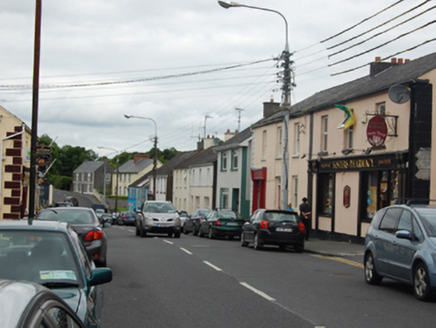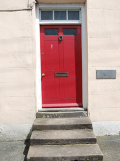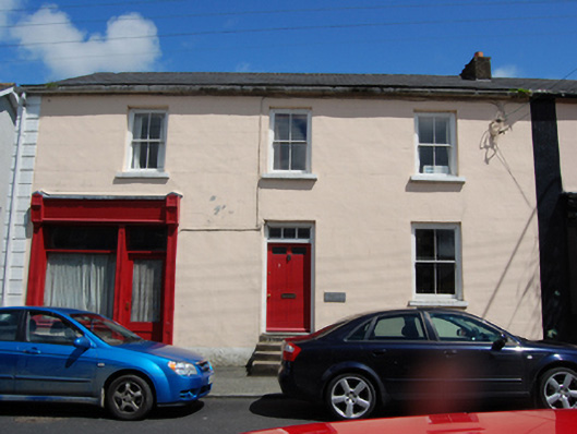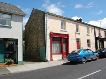 Semi-detached three-bay two-storey house, built c.1820, with shopfront to north bay. Pitched slate roof, shared rendered chimneystack to party wall, replacement rainwater goods. Ruled-and-lined rendered walls having continuous raised strip quoins to north corner. Rubble stone walls to gable. Window openings having stone sills and two-over-two timber sash windows. Central door opening with replacement door and multiple pane overlight approached by flight of steps. Timber shopfront comprising glazed door and large display window having panelled pilasters supporting plain fascia terminated by console brackets, steps to door.