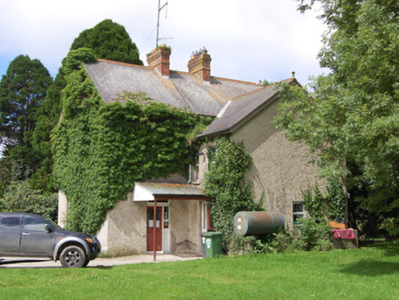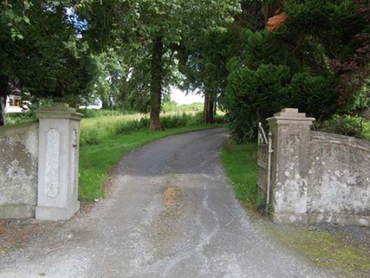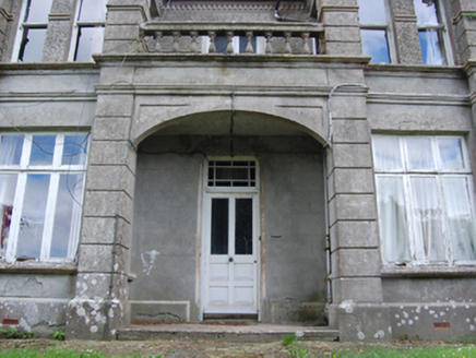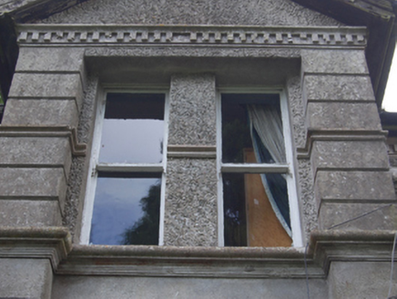 Detached three-bay two-storey house, built c.1920, with gabled projecting full-height end bays to front elevation, and two-bay two-storey return to rear. Now also in use as veterinary surgery. Pitched slate roof with terracotta ridge tiles, red brick chimneystacks with stepped collar bands. Timber bargeboards, terracotta finals to projecting bays and return, stepped finials near eaves flanking gables, cast-iron rainwater goods. Smooth rendered walls with bevelled smooth rendered plinth. Projecting bays having channelled banding to sides and roughcast render to gables, wiith dentillated course below, moulded double profile to mid height of upper paired windows with wetdash to wall between one-over-one timber sashes. Moulded string course to sill level of upper windows continuous across façade, with continuous smooth band and smaller moulded string below. Smooth rendered walls to gables. Roughcast rendered walls to rear and return. Triple light timber casements to ground floor of projecting bays with lights to sides and curved profile sills. Central bay of main elevation with arch below balcony. Panelled timber entrance door with glazed upper sections and overlight with margin panes. Wetdash render to balcony walls with dentillated course over continuing from gables and glazed timber double doors. Open stucco balustrade to front of balcony. One-over-one timber sashes with margin panes to gable elevations, rear and return. Replacement glazed rear and return doors with side and overlights. Decorative cast-iron double gates with scrollwork with square-profile rendered piers having decorative recess panels and stepped cappings, with flanking curved wing walls, having further piers with ball finials.