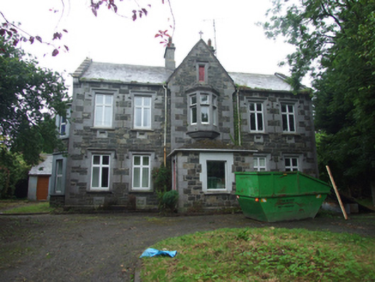 Detached Tudor-Gothic five-bay two-storey house, built c.1845, having central gabled breakfront with canted oriel window and later porch addition, three-bay two-storey return and single storey conservatory to rear, two-storey canted bay windows added to east gable. Now disused. Pitched slate roof with weathered limestone barge copings, cross finial to breakfront, hipped roof to porch with exposed rafter ends to eaves, pitched slate roof to return, uPVC rainwater goods. Ashlar limestone chimneystacks flanking central bay and over return having bevelled plinth and collar course. Random coursed squared and snecked rubblestone elevations with cut-stone punch-dressed quoins and bevelled stone plinth course. Smooth rendered walls to rear elevation and bay window, recent roughcast rendered walls to west gable, coursed rubblestone walling to return with brick dressings. Square-headed window openings with smooth bevelled cut-limestone block-and-start surrounds with Tudor hoods and tooled stone sills, replacement uPVC windows. Bevelled cut-stone surround and Tudor hood to louvred vent to gable. Bevelled mullions and transoms to oriel window with cut stone weathering and corbel. One-over-one timber sashes and timber casement windows to return, having central hip-roofed lucarne. Square-headed six-panelled entrance door with bolection mouldings to side of porch with plain overlight in smooth block-and start surround. Separate servant’s dwelling to southern rear corner having pitched slate roof, gable chimneystack, ruled-and-lined walls, punch-dressed quoins, and replacement windows and doors. Setback from road with wrought-iron gates in low ashlar limestone piers between rubblestone boundary walls. Cast-iron lanterns to driveway.