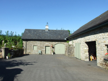 Detached three-bay two-storey house, built c.1820, with shallow projecting porch. Two-storey bow-ended extension to north, c. 2000, in same style as original house. Shallow artificial slate hipped roof with pair of symmetrical rendered chimneystacks, wide projecting eaves with timber soffit on paired decorative timber brackets, and recent pressed aluminium rainwater goods. Roughcast rendered walled with smooth bands to top and bottom. Render pilaster and entablature surround to door opening. Two-over-two timber sash windows with stone sills. Timber door with centre bead, eight raised bolection panels and fixed-glazed side and overlights. Single-storey outbuilding to north, recently renovated, having raised roof, sandstone random rubble walls, south gable incorporating part of former brick chimney stack and line of former roof profile. Additional outbuilding to the north-west with recent slate roof, squared and coursed sandstone walls, segmental-headed carriage arch and recent lantern with clock and weather vane. Rubble stone boundary walls with chamfered piers having elongated caps and spherical finials, c.1765.
