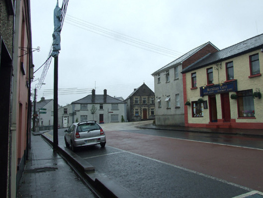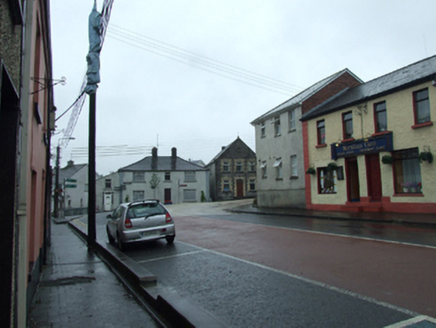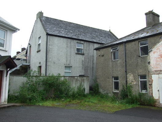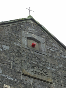 Detached gable-fronted three-bay two-storey Orange Hall, built 1874. Pitched replacement slate roof with stone fractable to gable and wrought-iron finial on apex stone, chimney to north-east gable, uPVC rainwater goods. Random squared rubble walls to gable front with dressed block-and-start quoins and bevelled stone plinth. Roughcast rendered walls to sides and rear. Flat-arched openings with yellow brick block-and-start dressings and uPVC windows. Raised stone dedication plaque with incised and low relief inscription 'ORANGE HALL 1874' above central window. Blind panel below gable apex with bevelled pointed stone surround. Recent timber sheeted door and overlight with stone step. Metal fire escape stair to rear first floor. Roughcast rendered boundary wall. Fronts directly on to street.