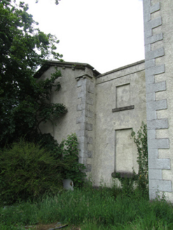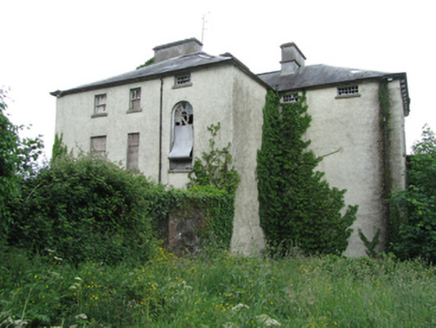 Detached neo classical three-bay two-storey over basement rectory with recessed centre bay, built c.1830, with half-dormer attic, three-storey projection to rear and two-bay two-storey outbuilding forming wing to north. Hipped slate roof with pair of rendered chimneystacks having string course and projecting capping flanking centre bay, timber dormers to south side. Cast-iron eaves gutters held on square modillion brackets. Roughcast rendered walls with limestone block-and-start quoins outer bays. First floor windows with patent reveals, stone cills and uPVC windows. Limestone ashlar architraves and entablatures to ground floor Wyatt windows, now with uPVC. Further windows and blind recesses to rear and side with patent reveals, stone cills, and historic sash windows. Round-headed stair window to rear with spoked upper section, horizontal windows to second floor below eaves to rear and return with multi-pane sash windows. Stone surrounds with keystones to openings in basement well to rear. Square-headed entrance door in limestone ashlar architrave with overlight and side lights surmounted by ashlar pediment on scrolled brackets, timber panelled door, sidelights and overlight boarded up. Internal window shutters with recessed fielded panels in place to most windows. Stone barge copings on stone brackets to gable of outbuilding to north, blind square and round-headed recesses to both levels with cut-stone sills. Rubble stone boundary wall, with square-profile piers flanking opening north of house and gate at site boundary.