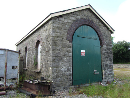Detached three-bay single-storey railway engine shed, built 1887, now disused. Pitched slate roof, clay ridge with elongated timebr ridge ventilator, timber fascia and barge boards. Squared random-coursed rock-faced limestone walls, with cut-stone arrises. Round-headed window openings to side elevations and west gable with three-course arches of engineering brick and stone sills, now boarded up. Round-arched door opening to east elevation with four-course brick arch and full-height timber sheeted double-leaf doors. Set in gravel area formerly amongst railway lines close to former railway station and station master’s house located to north-east.
