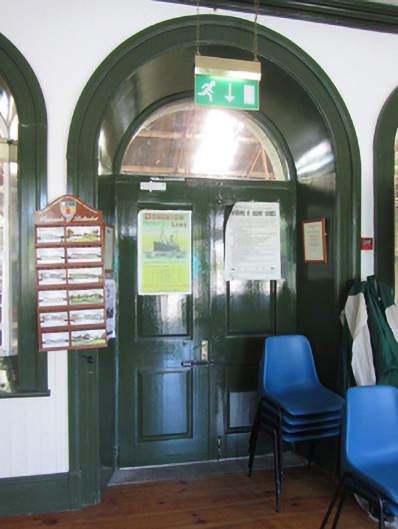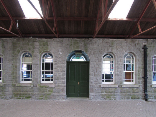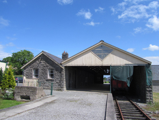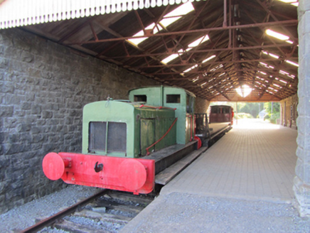 Attached nine-bay single-storey former railway station, built 1887, with gabled breakfront and projecting canopy, roofed platform and track to rear. Now in use as visitor's centre. Hipped slate roof, overhanging eaves with fascia and barge boards. Clay roll-moulded ridge tiles with three stone chimney stacks having string course and tapered capping, cast-iron rainwater goods. Timber canopy to entrance resting on decorative curved cast-iron wall brackets, timber sheeting to sides with serrated fringe. Snecked random coursed rock-faced ashlar limestone walls over, projecting plinth. Segmental-headed window openings and paired round-headed windows in breakfront flanking entrance, all with smooth dressed chamfered arrises and reveals, stone sills and historic timber sash windows with margin panes. Round-headed door opening with double-leaf timber panelled doors with fanlight. Entrance hall with cast-iron fireplace to west end, plaster cornice and surrounds to openings, rendered walls and recent timber floor. Platform elevation as entrance elevation. Corrugated-iron roof on steel truss roof resting on station platform elevation and squared-random rock-faced stone wall opposite. End gables of platform roof with vertical timber sheeting with serrated fringe. Platform floor of recent concrete paving slabs.