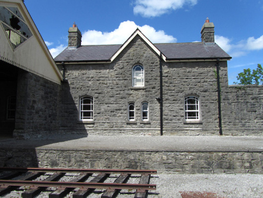 Attached three-bay two-storey former station master’s house with gabled centre bay, built 1887, facing former train platform and track to rear, with former railway station attached to west gable. Pitched slate roof with clay roll-moulded ridge tiles, stone chimneystacks over gables having string course and tapered capping. Oversailing eaves and verges having decorative timber trusses to barges on end and front gables, plain barge board to rear gable facing platform and plain fascia boards to eaves. Cast-iron rainwater goods. Snecked random coursed rock-faced ashlar limestone walls over projecting plinth. At first floor round-headed window in central bay to front and rear and segmental-headed window openings to gables, at ground floor segmental-headed window openings in outer bays and smaller paired segmental-headed windows to centre bay to rear, all windows having smooth dressed chamfered arrises and reveals, stone sills and historic timber sash windows, margin panes to all windows apart from smaller pair. Segmental-headed door opening with timber four-panelled door and single-pane overlight. Walled enclosure to of same stonework detail to east. Platform with random rubble stone retaining wall and steps to south.