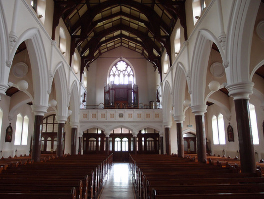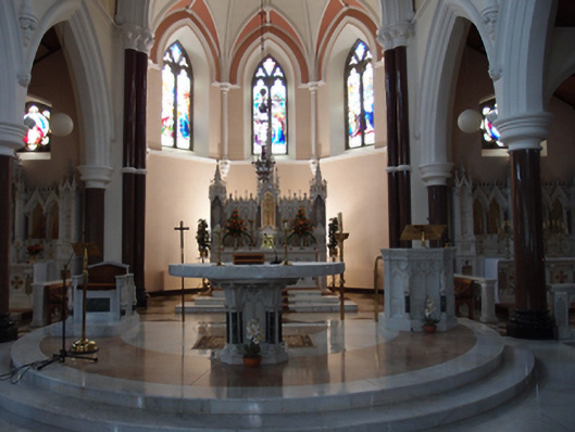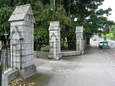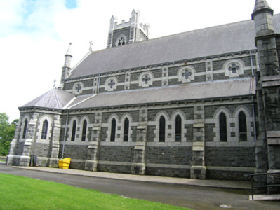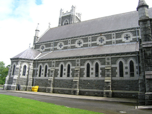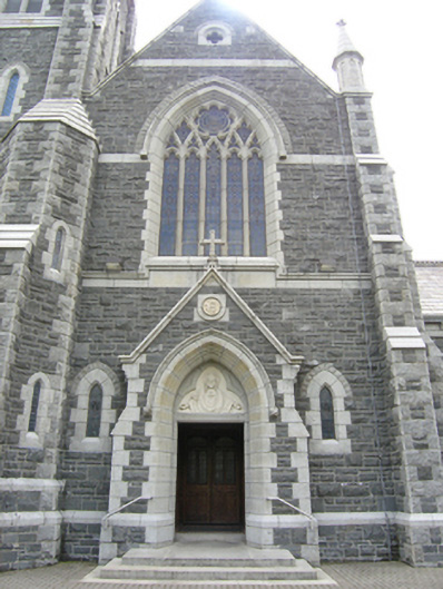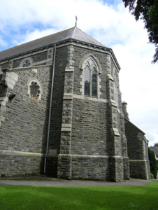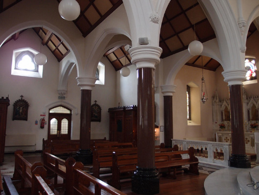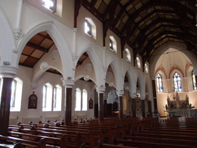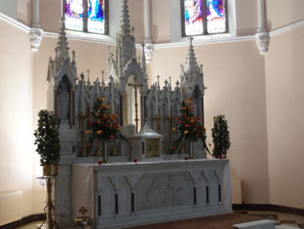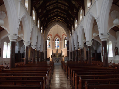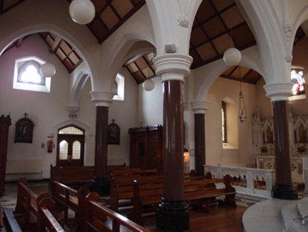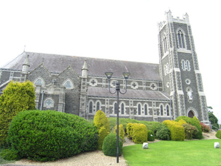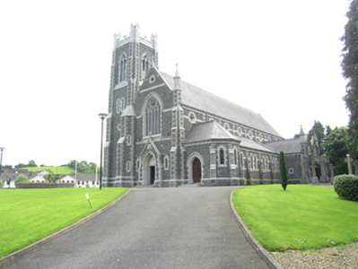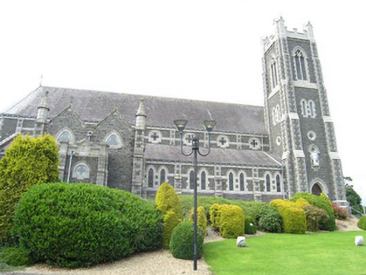 Freestanding Decorated Gothic cruciform-plan gable-fronted Roman Catholic church, built 1927-30, with aisles to nave, aisled transepts, apsed chancel, attached three-stage tower to east, single-storey baptistery to west, sanctuary added 1992 in same style. Pitched slate roof, crested ridge tiles, corbel table supporting profiled cast-iron rainwater goods. Hipped roof to baptistery and apse, paired pitches to transepts. Quarry faced random coursed limestone walls, lighter coloured limestone ashlar plinth string course and bands to openings, hammer dressed limestone to buttress quoins, splayed plinth course. Five-light cusped window to entrance gable with large roundel in head of pointed arch opening. Advanced entrance porch below with flanking lancets and having multiple orders and carved tympanum in deep-splayed dressed pointed arch opening. Entrance gable with stepped angled buttress to west and attached canted stairwell to east at junction with tower. Three-stage tower with battlemented ashlar parapets on corbel course and gabled corner turrets standing on stepped angled buttresses. Upper stage with open stone tracery to belfry lancets with hood mouldings, paired lancets to middle stage and roundel below. Buttresses define bay divisions of nave, paired lancets to nave aisles, quatrefoils to clerestory separated by piers. Triangular trefoil lights to transept double gables, porches below with crenellated ashlar parapets, angled buttresses and roundel windows. Stepped clasping buttresses to paired gable ends with octagonal-profile ashlar turrets and crocketed pinnacles. Interior with hammer beam timber roof supported on vault shafts, coloured coffered ceiling panels. Vault shafts in arcade spandrels supported on elaborately foliaged corbels with capitals and string course below clerestory level. Nave arcade supported on polished stone columns with tall polished bases, large moulded capitals, hood mouldings around pointed arcade arches on foliaged corbels. Diaphragm arches across aisles. Crossing supported on paired polished columns with tie ring at half height. Two-aisled transepts have eastern chapels. Apsed chancel with side altars, tiled floors, and communion rails. Elaborately crocketed and freestanding reredos and altar. Recent altar, ambo, and lectern placed in crossing on raised curved area with steps. Entrance porch in north bay with panelled gallery front supported on a three bay arcade of polished columns and depressed arches. Timber screen to entrance under gallery across full width of nave with glazed timber doors, side lights, and overlights. Timber screen in west aisle to north-west chapel. Elaborate organ in gallery. Dark coloured timber pews and confessionals. Entrance gates to east and west of boundary to road, with quarry faced boundary wall having squared Scotch copings. Gates with gabled ashlar piers flanking cast-iron gates, set in curved railings on stone plinth with end gabled piers.