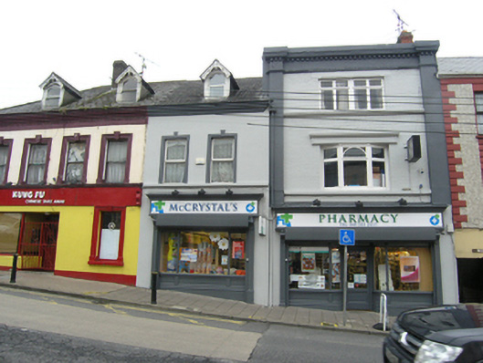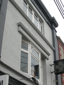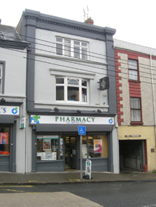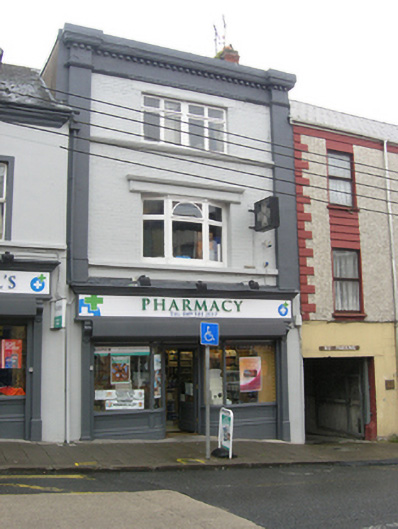 Attached single-bay three-storey house with shopfront, built c.1920. Roof hidden behind blocking course, cast-iron rainwater goods. Dentilled stucco cornice with entablature supported by wide flanking pilasters. Pilasters rise from entablature cornice of historic shopfront. Brick walls to upper storeys between pilasters, string course under second storey casement window pair. Bow-fronted first floor window under profiled architrave and cornice with timber window having openable central toplight with round inset profile. Recent shopfront, nameboard, and shutter box having canted timber panelled stall risers with fixed pane display windows and glass panelled door.