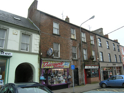 Pair of two-bay three-storey houses, built c.1800, with return to rear, and shopfronts inserted to ground floor. Now in use as retail outlet and public house. Pitched slate roof with red brick chimneystacks and replacement rainwater goods. Red brick walls laid in Flemish bond. Window openings to upper floors with brick flat-arches, stone sills, and timber two-over-two sash windows. Door opening with timber panelled door, overlight, and stone threshold. Single- and two-storey outbuildings with pitched slate roofs and rubble stone walls to rear. Recent shopfronts to ground floor.