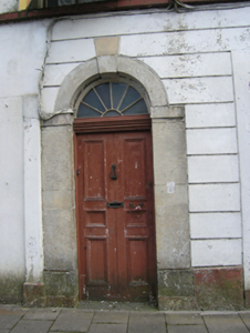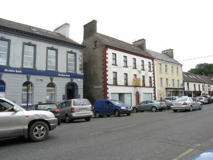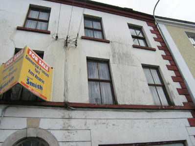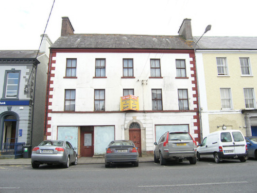 Attached five-bay three-story with dormer attic house, built c.1800, having shopfronts inserted to ground floor, two-storey return to rear. Now disused. Pitched slate roof, wide brick chimneystacks on gable, cast-iron rainwater goods. Rendered walls with moulded cornice and stone quoins. Continuous sill course to first floor windows. Section of channelled render banding remaining to centre of ground floor. Roughcast rendered walls to gable and rear. Windows to upper floors with stone sills and replacement timber casement windows. Two-over-two timber sashes to gable. Round-headed stone door surround with wide jambs, six-panelled door with bolection moulding, moulded timber entablature with spoked fanlight above. Symmetrical shopfront with recessed timber door and large fixed-pane windows to northern bays, wide fixed-pane window in southern bays.