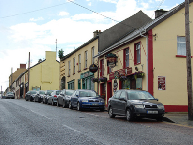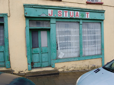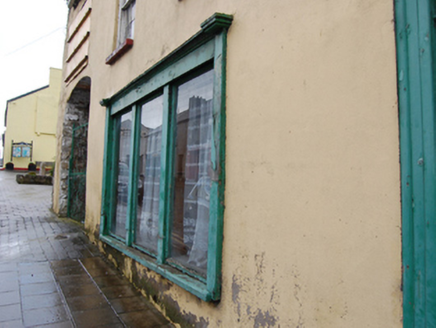 Attached six-bay two-storey house, built c.1750, with integral carriage arch in south bay, and shopfront and display window inserted to ground floor. Pitched replacement slate roof with rendered chimneystack and replacement rainwater goods. Smooth rendered walls. Window openings to first floor with stone sills and six-over-six timber sash windows with exposed sash boxes. Segmental-headed window opening, now blocked, above carriage archway. Door opening between shopfronts with half-glazed timber panelled door and fixed overlight. Timber shopfront to north having double-light display window, half-glazed double leaf doors with fanlight over, and plain fascia over with raised lettering. Large triple-light display window to south with timber cornice over. Segmental-headed integral carriage arch with wrought-iron gate. Replacement windows to rear elevation. Outbuildings to rear with slate roofs and lime-washed random-rubble walls and remains of timber windows.