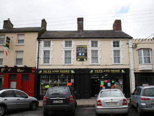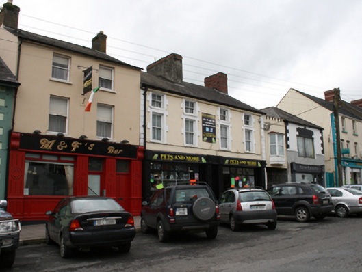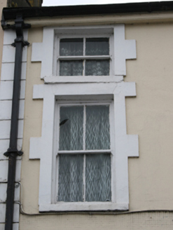 Pair of terraced four-bay three-storey houses, built c.1800, ground floor now in use as a single shop. Attached bay with integral carriage arch added c.1950 to north. Pitched slate roof with red brick chimneystack to north gable and rendered chimneystack to centre, cast-iron rainwater goods and timber soffit. Roof to north single-bay addition concealed behind castellated parapet. Ruled-and-lined rendered walls with channelled stucco piers to sides. Block-and-start render surrounds to windows with stone sills. Two-over-two timber sliding sash windows to first and second floor, taller windows to first floor. Recent shopfront spanning two buildings. uPVC oriel window to first floor and wrought-iron gate to square-headed carriageway, to northern exension.