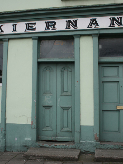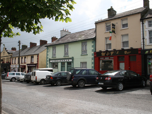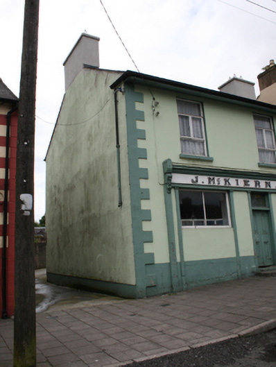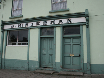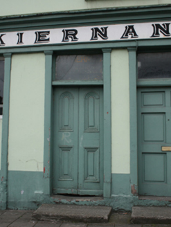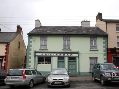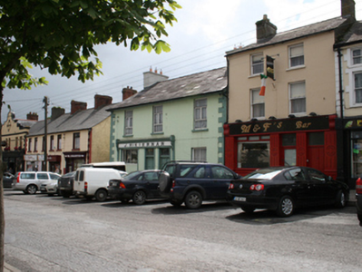 Attached three-bay two-storey house, built c.1800, with shopfront inserted to ground floor and return to rear. Formerly also in use as public house. Pitched slate roof with clay ridge tiles, recent rendered chimneystack to gable-end and to ridge, overhanging eaves, and replacement rainwater goods. Ruled-and-lined rendered walls with raised stucco quoins and stone sills to openings. Replacement windows to first floor. Two-over-two timber sliding sash window to ground floor. Shopfront comprising timber window and pair of door openings each flanked by plain timber pilasters, having terminating plain pilasters with decoratively carved corbels supporting a profiled fascia and stepped cornice. Display window reduced in sized with recent raising of stallriser. Internal timber and glass screen to display window. Timber panelled double-leaf doors to public house with round-headed top panels and overlight with gold lettering. Replacement timber panelled door with overlight to residential entrance. Stone thresholds to doors.