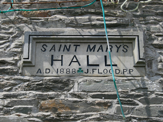 Attached late Victorian six-bay two-storey former parish hall, built 1888, with off-centre projecting gabled two-storey porch. Pitched slate roof with crested terracotta ridge tiles, limestone coping, stepped red brick chimneystacks to gable ends with saw-tooth collars and clay pots, terracotta finial to apex of porch, carved limestone kneelers to gable end walls and to entrance porch, replacement rainwater goods. Rubble stone walls with limestone quoins and deep moulded red brick cornice, red brick block-and-start quoins to porch. Plaque to front elevation wall reads ‘St. Mary’s Hall AD1888 J Flood P.P’. Segmental-headed window openings with red brick reveals and stone sills. Windows comprising original two-pane top timber sash and replacement lower casement sections. Round-headed door opening in ground floor of porch with red brick reveals and arch, plain glazed fanlights over replacement timber doors, having limestone thresholds and jamb-stones. Recent concrete steps to either side of porch with rendered side walls providing access to recent first floor doorways.
