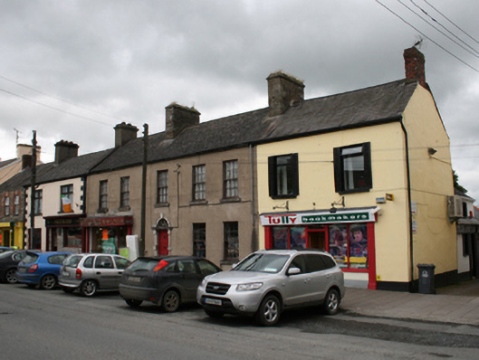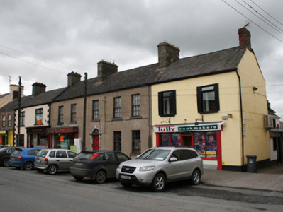 Terraced five-bay two-storey house, built c.1780, with shopfront to ground floor. Formerly also in use as post office. Pitched replacement slate roof with ashlar chimneystack to centre and to south party wall, rendered chimneystack with stone coping stone to north party wall, cast-iron rainwater goods. Ruled-and-lined rendered walls with stone eaves corbel course and channelled stucco piers. Replacement six-over-six timber sash windows to ground and first floor. Central doorcase comprising round-headed opening with limestone block-and-start surround, cornice, and arch with keystone, having timber petal fanlight and replacement timber panelled door, with sandstone threshold and concrete step. Shopfront to north end having fluted timber pilasters with replacement timber fascia over, surrounding display window on low plinth with stone sill and metal guard rail, and recessed glazed double timber doors with fixed overlight.