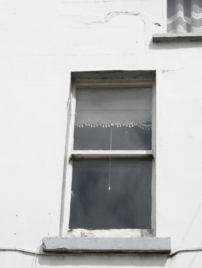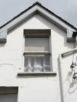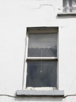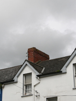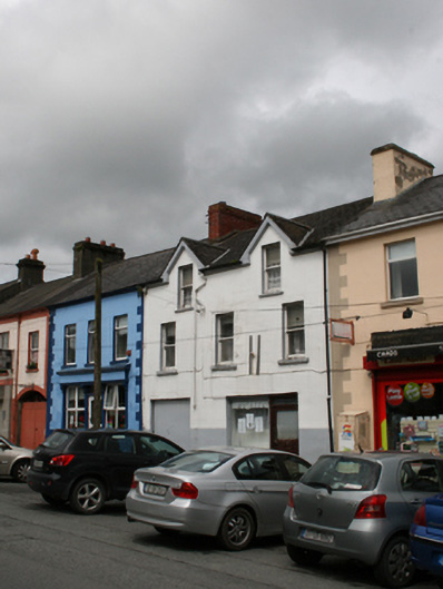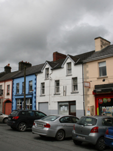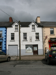 Terraced three-bay two-storey with dormer attic house, built c.1860, with integral carriage arch and disused shopfront to ground floor. Pitched replacement slate roof, red brick and rendered chimneystacks to party walls, cast-iron and replacement rainwater goods. Dormers with gablets and plain bargeboards. Ruled-and-lined rendered walls. One-over-one timber sash windows with stone sills. Shopfront inserted c.1940, with plain window and replacement timber door. Recent metal door to carriage arch opening.